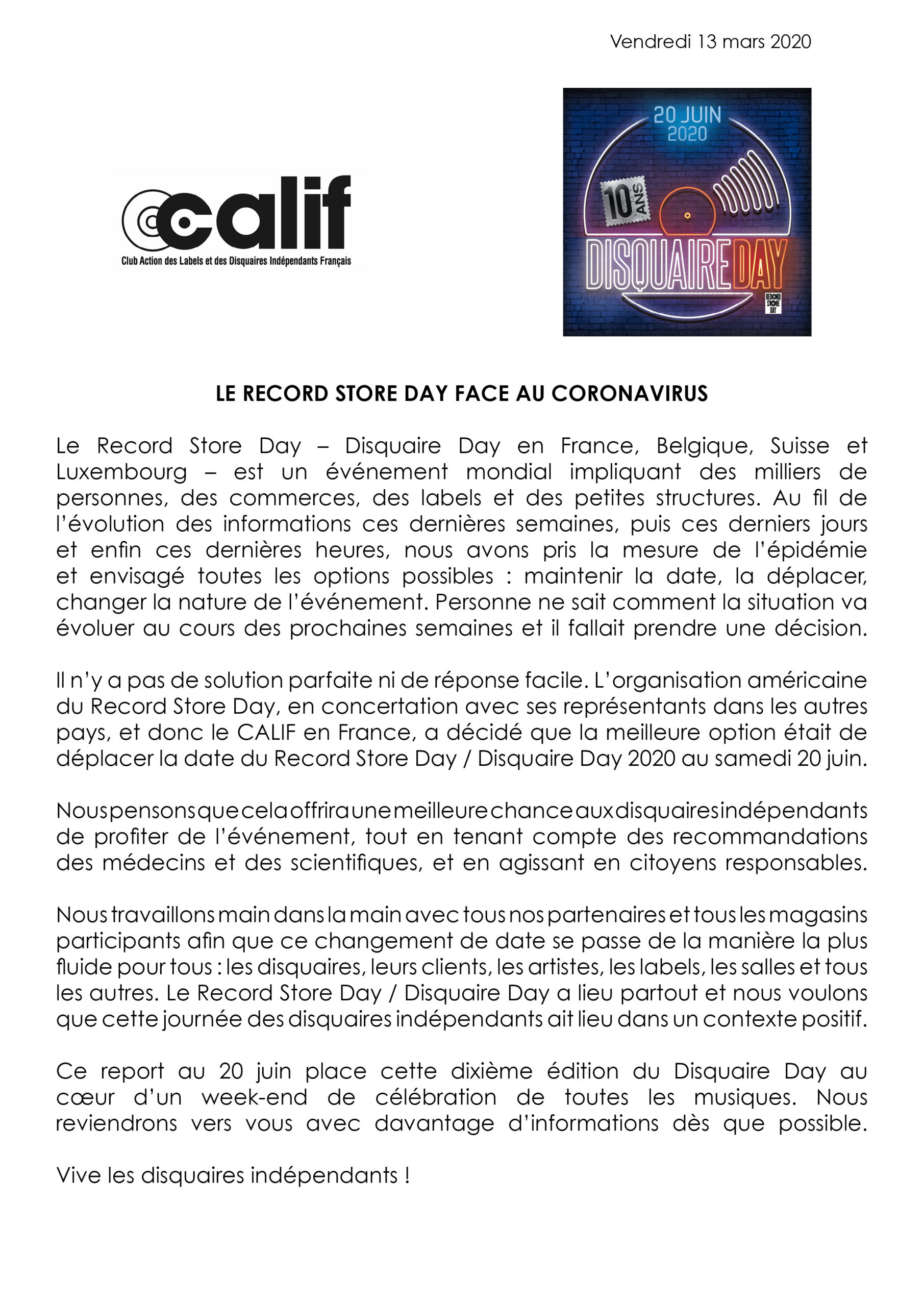 « Il n’y a pas de solution parfaite ni de réponse parfaite, peut-on lire dans le communiqué de presse. L’organisation américaine du Record Store Day, en concertation avec ses représentants dans les autres pays, et donc le CALIF en France, a décidé que la meilleure option était de déplacer la date du Record Store Day/Disquaire Day 2020 au samedi 20 juin« .