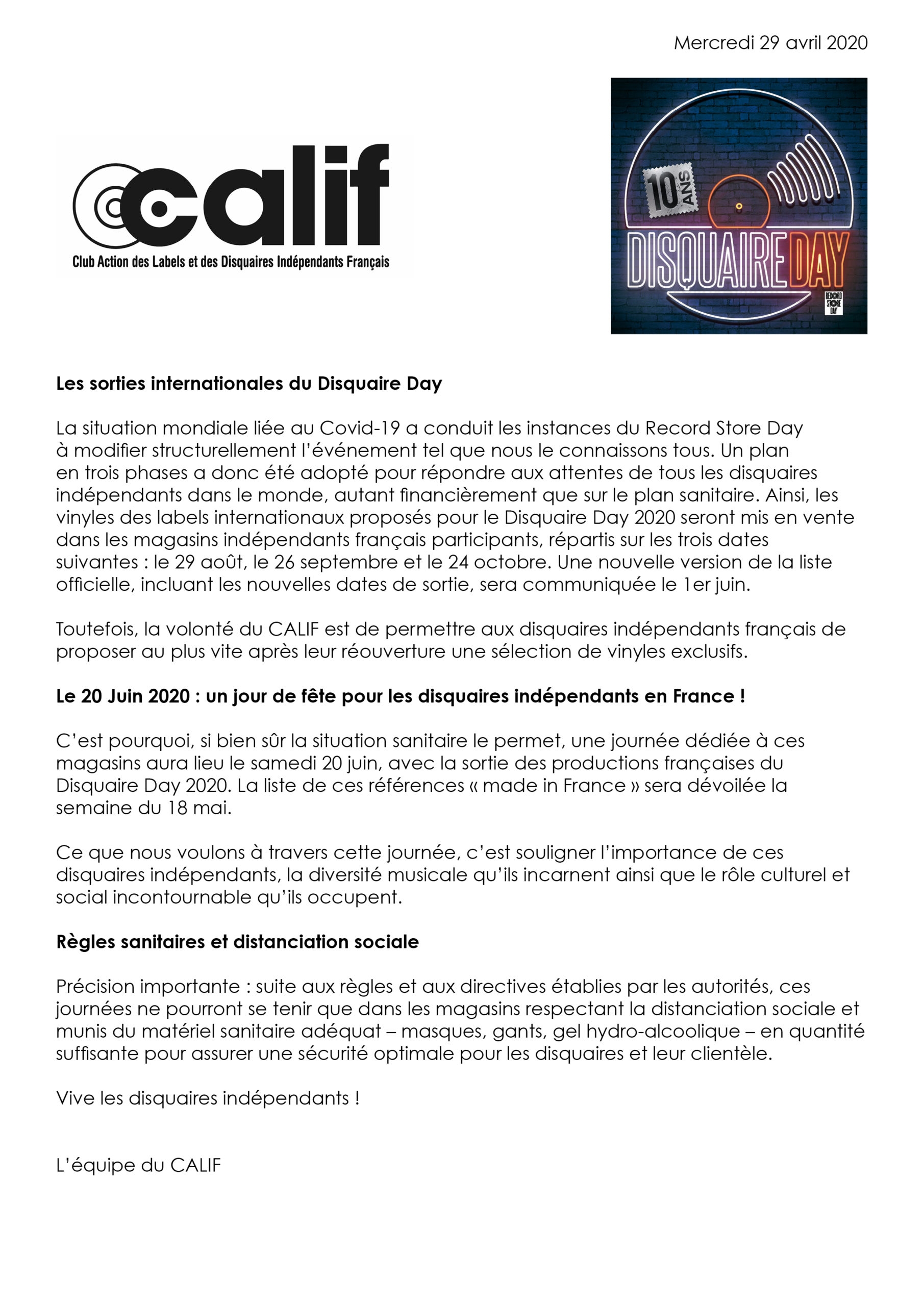 L’équipe du CALIF a transmis un communiqué par rapport au Record Store Day / Disquaire Day 2020.